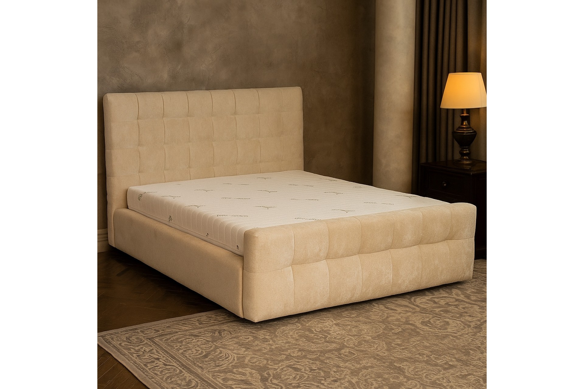 Atât tăblia, cât și cadrul frontal al patului AMOS NEW sunt realizate cu același model pătrat, ușor adâncit, oferind un aspect unitar, voluminos și sofisticat. Acest detaliu geometric creează senzația de lux, fiind ideal pentru dormitoare spațioase și amenajări elegante.